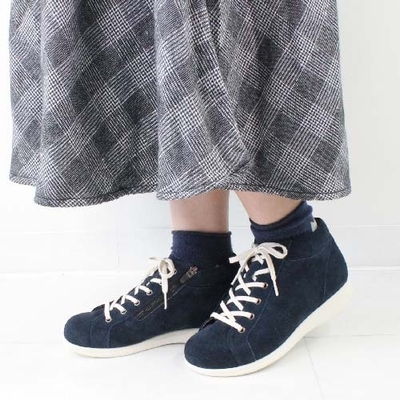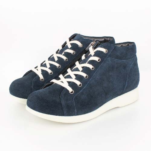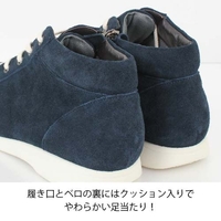 甲材:牛革、裏材:ポリエステル+アクリル,豚革、紐:綿、本底:ポリウレタン、ヒール:約2.5cm、筒丈:約9cm、重さ:約320g(片足23.5cm)、日本製、アッシュブルー:22.5〜25.0cm、ネイビーベロア:22.5〜25.0cm、ワイズ:3E