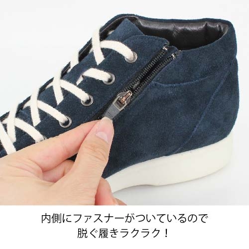 甲材:牛革、裏材:ポリエステル+アクリル,豚革、紐:綿、本底:ポリウレタン、ヒール:約2.5cm、筒丈:約9cm、重さ:約320g(片足23.5cm)、日本製、アッシュブルー:22.5〜25.0cm、ネイビーベロア:22.5〜25.0cm、ワイズ:3E