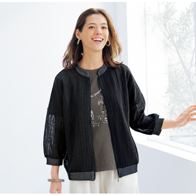 暑い季節の羽織りに重宝するレースを贅沢に使ったジャケット。織り柄レースが上品な透け感を叶え、さりげないリブ使いでカジュアル感も演出。どんなスタイルにもなじみます。