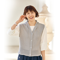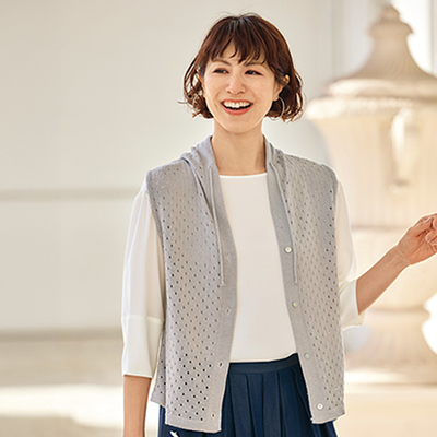 ドット状に透ける編み柄が涼しげな前開きニットベスト。パーカー風に仕立てたデザインだから、こなれた印象で着こなせます。