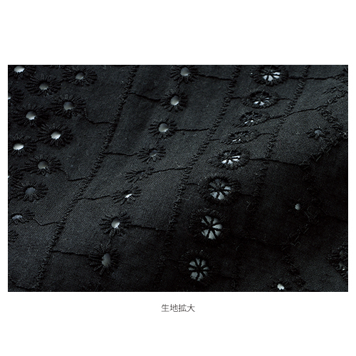 シックな黒の羽織り物は、軽やかな総レースなら、見た目も着ごこちも涼やかに冷房対策ができます。広めの袖口は抜けを演出しつつ手首も華奢見せしてくれます。