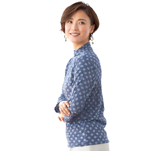 大人可愛い6分袖の水玉ジャカード柄。首回りはボトルネックで伸びのあるカットソー素材。