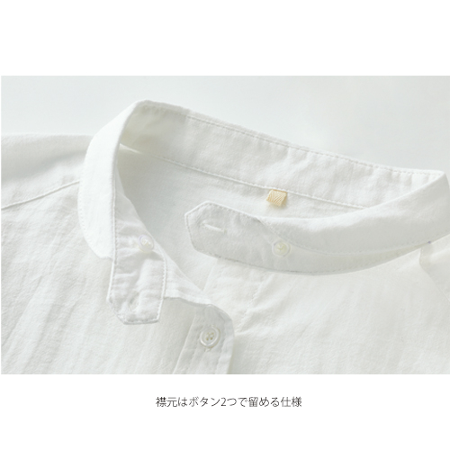 一見シンプルに見えて、襟元にひとクセ効かせた洗練シャツ。2つボタンで留めたスタンドカラーを小さな丸襟で飾ったデザインに、ほのかなトラッド感と甘さが香ります。襟元はボタン2つで留める仕様。