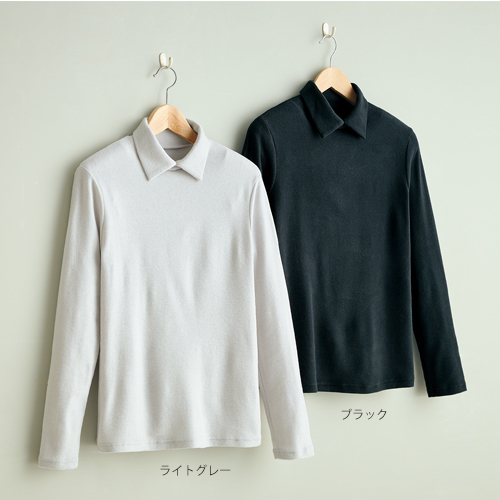 着心地らくちんなカットソーを、ゆるすぎないシルエットと襟付きデザインで、きちんと見えする上品なトップスに仕上げました。微起毛素材が心地よく、深い彩りが一枚でも重ね着にも活躍します。