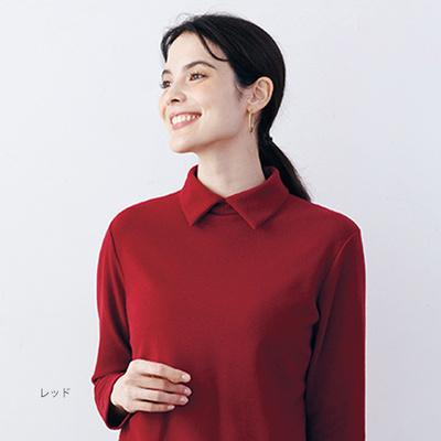 着心地らくちんなカットソーを、ゆるすぎないシルエットと襟付きデザインで、きちんと見えする上品なトップスに仕上げました。微起毛素材が心地よく、深い彩りが一枚でも重ね着にも活躍します。