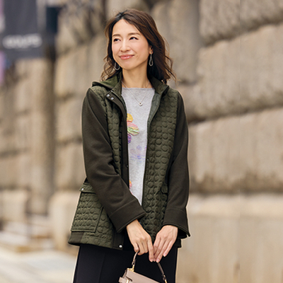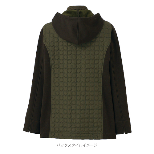 デザインキルティングと裏ボアカットソー素材の切り替えがポイント。フラップポケットをあしらいお洒落なデザインです。