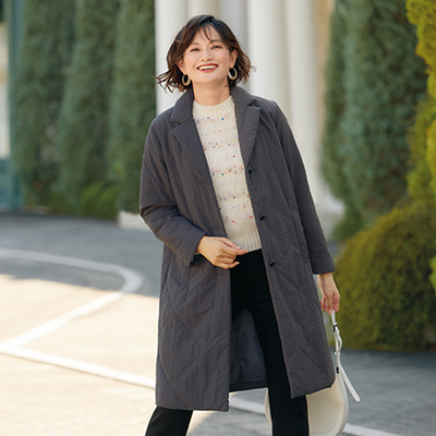 着ぶくれ感を抑えてほっそり、テーラード襟の中わたコート。