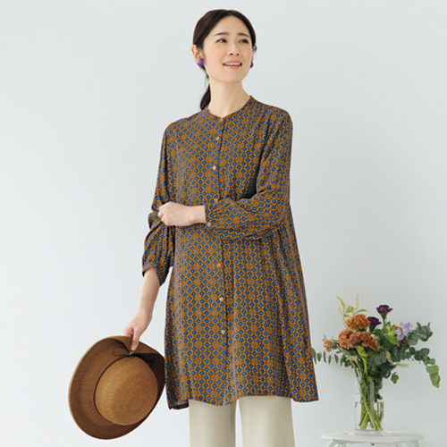 レトロで美しい小紋柄風プリントのチュニックはなめらかな素材。歩くたびにエレガントに揺れるゆったりシルエットながら、きれいな落ち感で細見えするのも魅力です。
