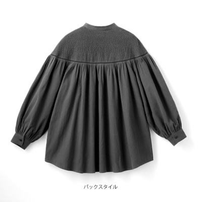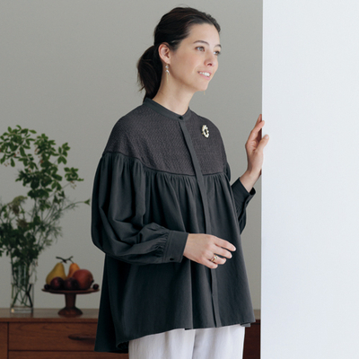 たっぷりギャザーが描くドレープが綺麗で、ヨークの刺しゅうが上品です。一枚で華やぐブラウスをシックな色と比翼仕立てですっきり仕上げました。