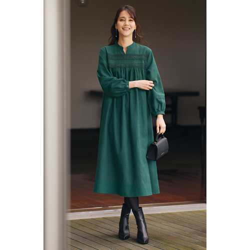 グリーンの優しさと微起毛のぬくもり感じるワンピース。
