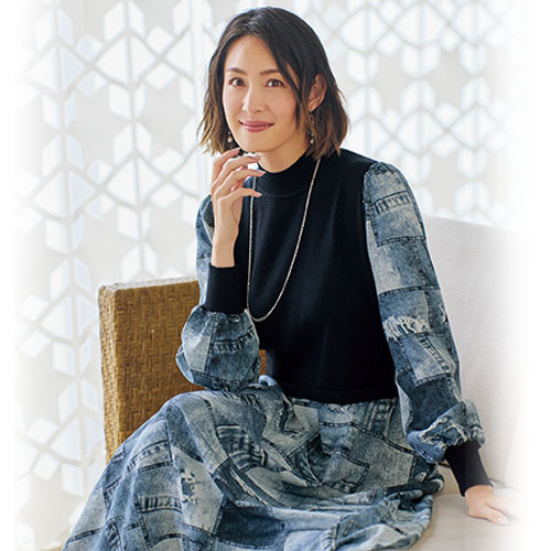 身頃と袖口をニットで切り替えた重ね着風のデザイン。プリント生地はドレープ性も美しく、これ1着で旬のエレガンススタイルが完成します。