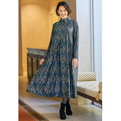 ダマスク柄風の彩りが映える流麗ジャージーワンピース。