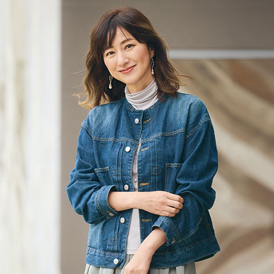 ステッチなどのあしらいはそのままに、首元に抜けを作るラウンドカラーでGジャンのカジュアルさを引き算。大人に似合うアイテムに格上げしました。シンプルなタートルネックに羽織るだけでこなれた印象に。