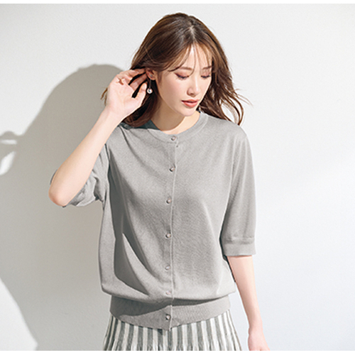 シャイニーニット半袖カーディガン ライトグレー L