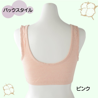バスト部分もコットンだから 汗をしっかり吸収し、ノンワイヤーなのでつけ心地も快適。 フィットネスや就寝時などにもおススメ。伸縮性の良い天竺生地を使用しています。