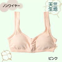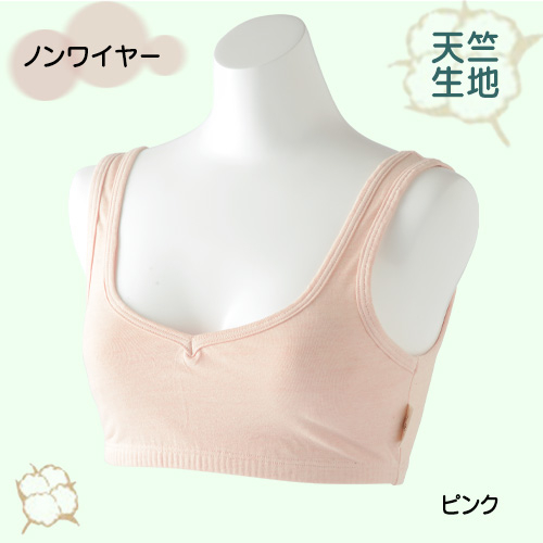 バスト部分もコットンだから 汗をしっかり吸収し、ノンワイヤーなのでつけ心地も快適。 フィットネスや就寝時などにもおススメ。伸縮性の良い天竺生地を使用しています。