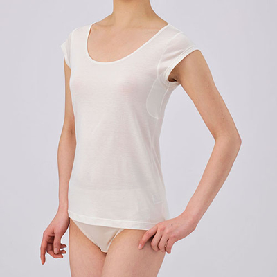 汗をかいた時でも汗じみが目立ちにくいように脇を二重にしました。冷房の効いた部屋などで夏でも肩の冷えが気になる方にも安心なフレンチ袖。インナーに適した爽やかなシルクニット素材です。