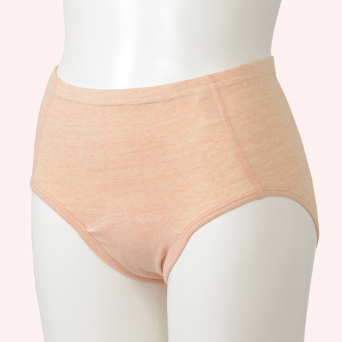 長めの履き込み丈が、お腹とヒップを包み込んでくれる防水布をパッド部に入れたサニタリーショーツ。伸縮性の良い天竺生地を使用。