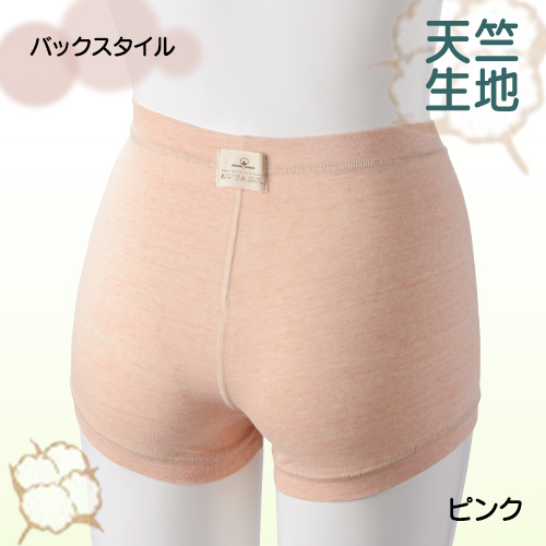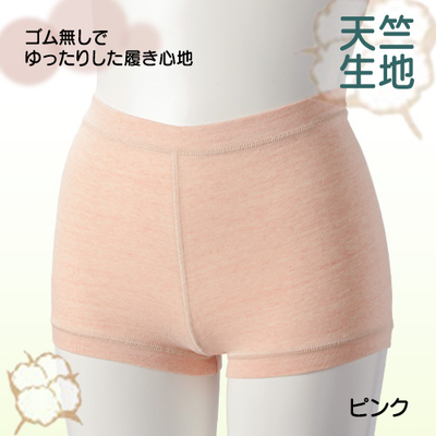 ゴムを使用していないソフトなフィット感のショーツです。股上深めでお腹もお尻もやさしく包みます。フラットな縫い目や、タグの外付けなど肌に優しい工夫がしてあります。伸縮性のよい天竺生地を使用しています。