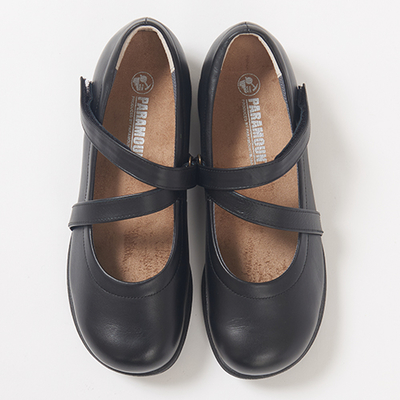 甲材:牛革、裏材:ポリエステル+アクリル、豚革、本底:ポリウレタン、ヒール:約2.5cm、重さ:約250g(片足23.5cm)、日本製、黒:22.0〜25.0cm、ハニーピーチ:22.5〜25.0cm、ワイズ:4E