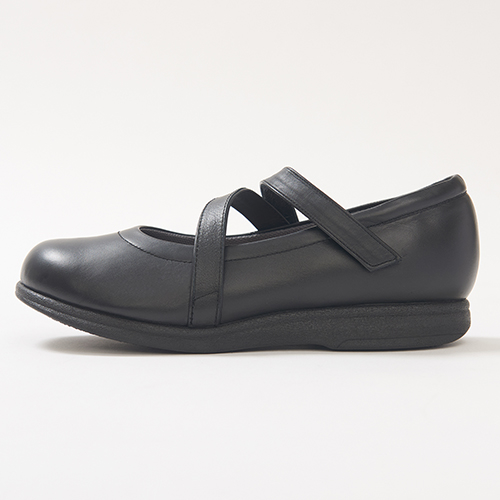 折り返しのベルトでしっかりとフィットするカジュアルパンプス。ゆったり4Eワイズなので幅広甲高の方にもおすすめです。甲がしっかり押さえられるので、足がブレず軽快に歩けます。