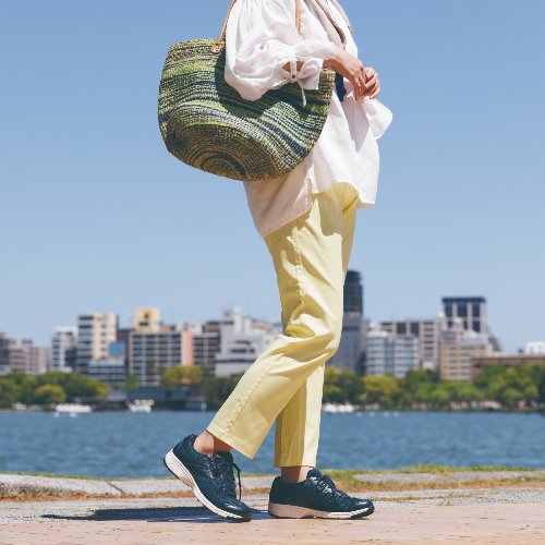 アッパー:ポリエステル/天然皮革 底:合成底(EVAコンプレッション+ラバー)足囲:4E踵高さ:4.5cm重量:320g(23.5㎝方足) 生産国:カンボジア製
