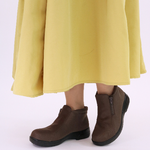 サイドファスナー付で、履き口が大きく開き脱ぎ履きしやすいつま先ゆったり、ショートブーツ。優れた防水耐久性と透湿性の高い機能素材「ゴアテックスファブリクス」を採用しており雨の日も快適です。グリップ力を発揮するガラス繊維と特殊なラバーを独自の製法で配合し氷上や滑りやすい床にも対応したオールラウンド対応ソールです。