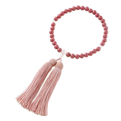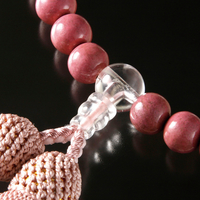 さくらの木珠に花びら色を丁寧に塗ったものを主珠にしたさくら念珠。親玉と二天玉に水晶を配し、房は正絹の灰桜色に。京都の職人が上品に仕立てました。どの宗派でも使えます。