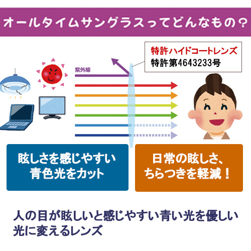鯖江のレンズメーカーが作ったサングラスです。特許取得のレンズで、紫外線や青色光線から大切な目を守ります。レンズの色が薄く、色の濃いレンズに抵抗のある方や、屋内でも眼鏡を掛けている感覚で使用できます。靭性のあるチタン製のフレームを採用し、長く使用しても疲れにくいです。散歩や外出時、パソコンやスマートフォンを使用する際など、様々な場面で活躍するオールタイムサングラスです。