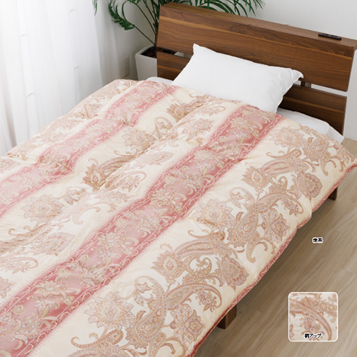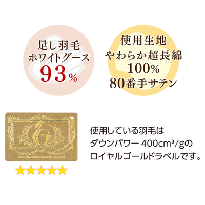 ●側地/超長綿100%サテン(80番手/405本) ダウンプルーフ加工 立体キルト加工●足し羽毛/ホワイトグースダウン93% スモールフェザー7%(ロイヤルゴールド/かさ高16.5cm ダウンパワー400cm3/g)300g●側サイズ/150cm×210cm●日本製
