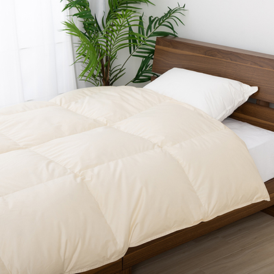 ●側地/超長綿100%サテン(60番手/打込本数360本) ダウンプルーフ加工 立体キルト加工●中身/ホワイトダックダウン90% スモールフェザー10%(エクセルゴールド/かさ高14.5cm ダウンパワー350cm3/g)●中身重量/1.3kg●側サイズ/150cm×210cm●日本製