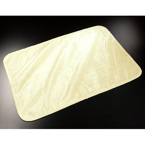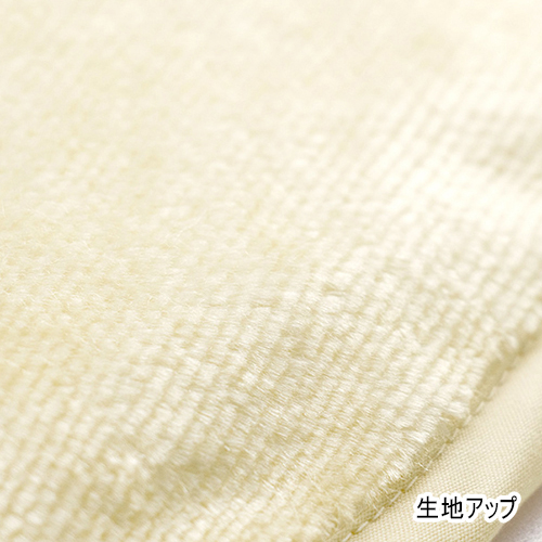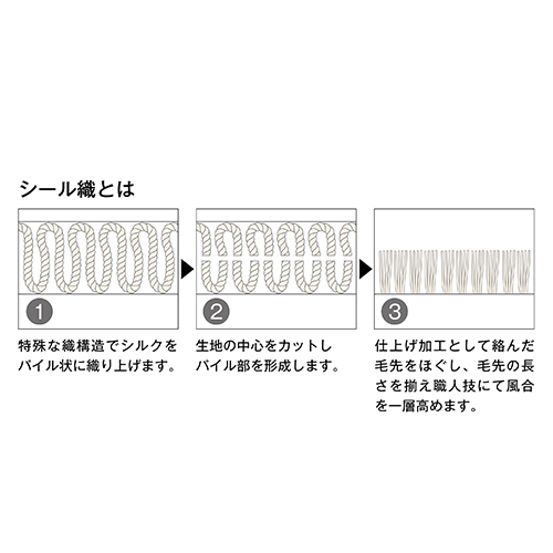 表の面は、しっとりとした風合いが特長の天然シルク素材。パイル状に織り上げた後でループ部分をカットしたシール織りの生地を使用し、柔らかい肌触りと弾力があります。裏面は吸放湿性のある綿素材です。
