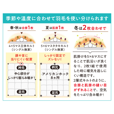 ●側地/ポリエステル85% 綿15%(ブロード) ダウンプルーフ加工 合掛:立体キルト加工 肌掛:タタキキルト加工●中身/フランス産ダックダウン93% スモールフェザー7%(嵩高16.5cm ダウンパワー400cm3/g)●中身重量 合掛:0.7kg 肌掛:0.3kg●サイズ/150cm×210cm●日本製