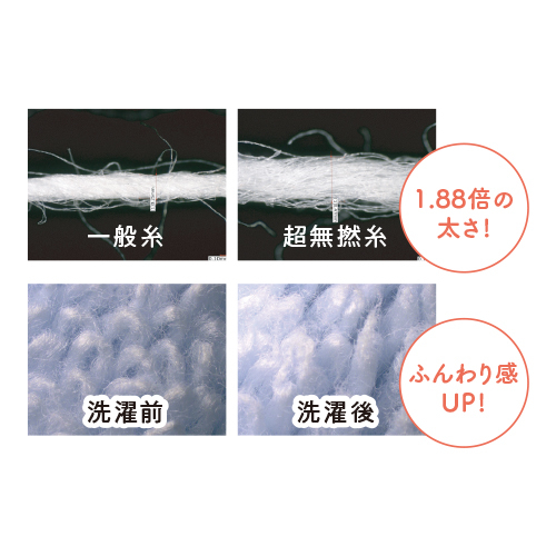 特殊撚糸super zero(R)をさらに進化させた無撚糸以上の「超無撚糸」。super zero(R)の特徴はそのままに、毛羽落ちや耐久性を改善しました。さらにパイル部分にはオーガニックコットンを使用し、織り方にもこだわっています。