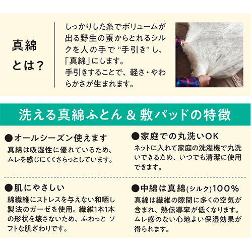 繭(シルク)を手引きで丁寧に伸ばして作られる真綿を使ったふとんです。