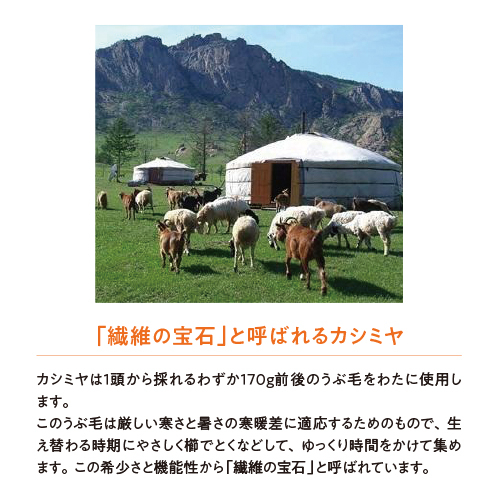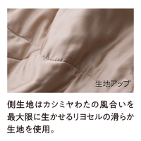 中綿にたっぷりのカシミヤを使用。側生地はカシミヤわたの風合いを最大限に生かせるリヨセルのなめらか生地を使用。