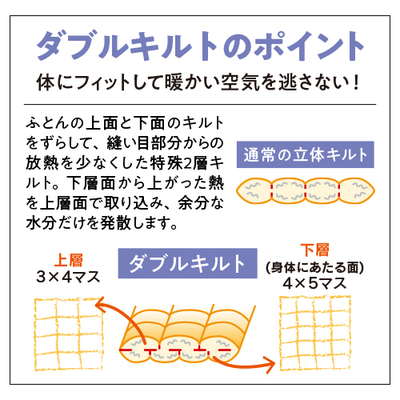 ●側地/超長綿100%サテン(100番手/打込本数410本)ダウンプルーフ加工 ダブルキルト加工●中身/ポーランド産マザーグースダウン95% スモールフェザー5%(嵩高18.0cm ダウンパワー440cm3/g プレミアムゴールド)●中身重量/1.1kg●サイズ/150cm×210cm●日本製(側地/中国製)