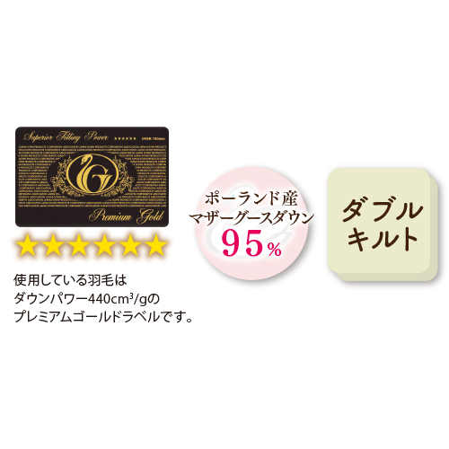 貴重なポーランド産ホワイトマザーグースダウンを95%使用。弾力性・かさ高性・保温性の全てが高品質。