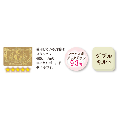 ●側地/超長綿100%サテン(60番手/打込本数360本)ダウンプルーフ加工 ダブルキルト加工●中身/フランス産ダックダウン93% スモールフェザー7%(嵩高16.5cm ダウンパワー400cm3/g)●中身重量/1.2kg●サイズ/150cm×210cm●日本製(側地/中国製)