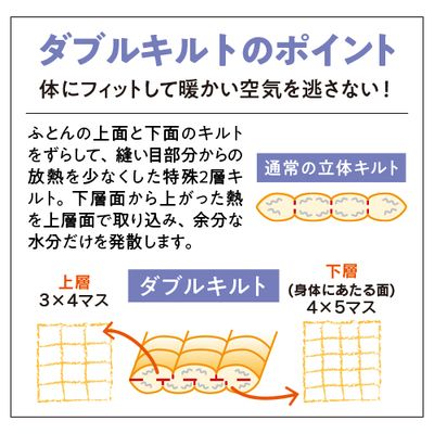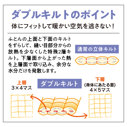 ダブルキルトがふとんの中の暖かい空気を逃さず、空気をたっぷり含んでふっくらあたたか。寒い時期も快適に眠れます。