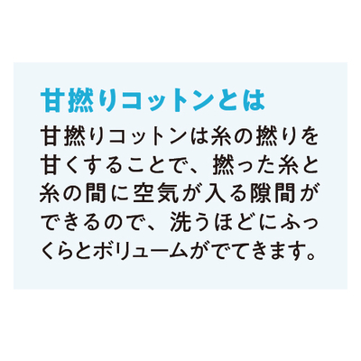 甘撚りタオルが生み出す、ふっくらとした風合い。糸を撚る回数を少なくすることで優しい肌ざわりに。