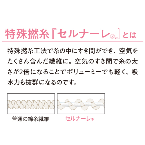 特殊撚糸による抜群の速乾性で部屋干しが多い方におすすめ。片面ガーゼなので、軽量でかさばらず、洗うたびに柔らかくなります。