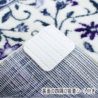 ベースには数色の糸をブレンドし、ウイルトン織りならではの織模様を表現しています。四隅に吸着タイプの滑り止めが付いており、フローリングの上で固定できます。