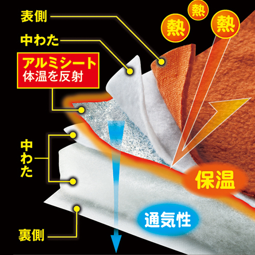 体温を反射・蓄熱・保温!アルミシートの両面を中わたで挟んで無数の針で絡ませ一体化させる特殊ニードル加工により、保温性がありつつ蒸れにくい「モアホット」を使用した6層構造です。