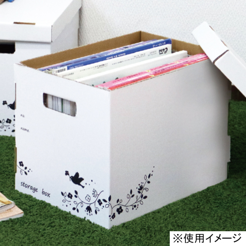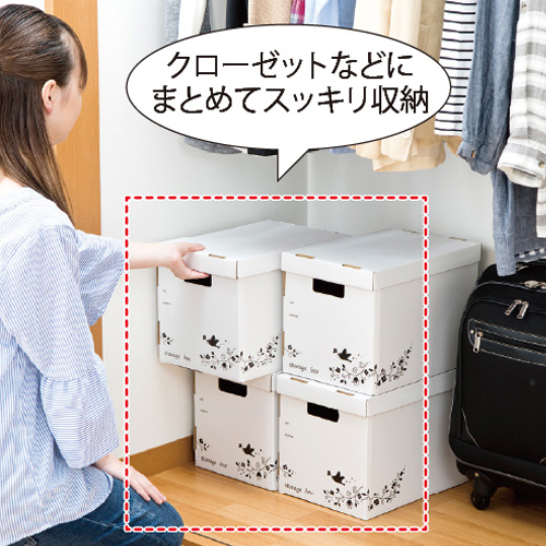 ●ダンボール●幅23.5×奥行34×高さ24.5cm●345g(1個)●耐荷重:本体5kg、天面10kg(スタッキング使用時)●セット内容:本体A、本体B、底パッド、フタ各4枚●組立品●日本製
