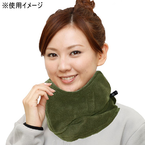 マスクのように耳に掛けて首後ろでスナップボタンを留めるだけの簡単装着。開口部があるので息抜けがよく、着けたまま水分補給でき、眼鏡が曇りにくい。首に巻けばマフラー代わりに。耳ひもを外して内側に折り込めば 首もとあったか。