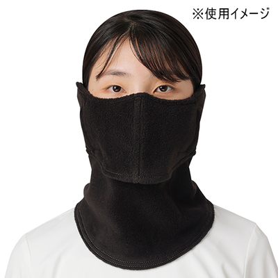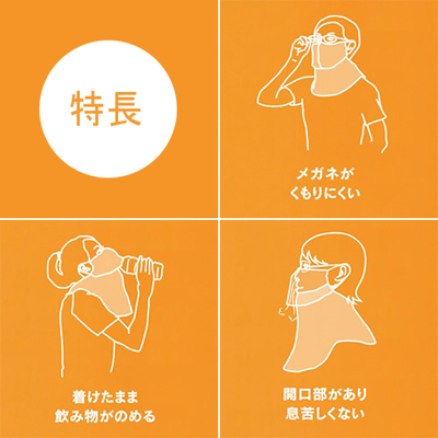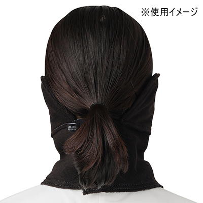 マスクのように耳に掛けて首後ろでスナップボタンを留めるだけの簡単装着。開口部があるので息抜けがよく、着けたまま水分補給でき、眼鏡が曇りにくい。首に巻けばマフラー代わりに。耳ひもを外して内側に折り込めば 首もとあったか。