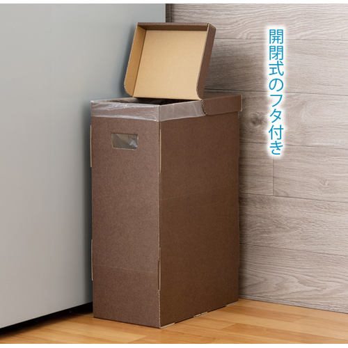 45L用のゴミ袋にぴったり。折りたたんで省スペース収納。開閉式のフタ付きでにニオイも漏れにくい。ダンボールだから扱いもラクラク。組立て時間目安:20〜30分(1人)
