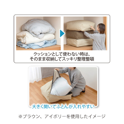 シーズンオフのふとんを収納しながらクッションとして使える便利なシリーズ。クッションとして使わない時は、そのまま収納してスッキリ整理整頓。ふとん1枚が入った大きなクッションは大人が座ってもゆったり。大きく開いてふとんが入れやすい。持ち手付きで持ち運びに便利。