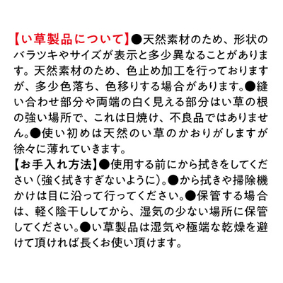 ●国産い草100%(袋三重織) 裏面/ウレタンフォーム●ヘリ/綿85% 麻15%●厚さ10mm●日本製